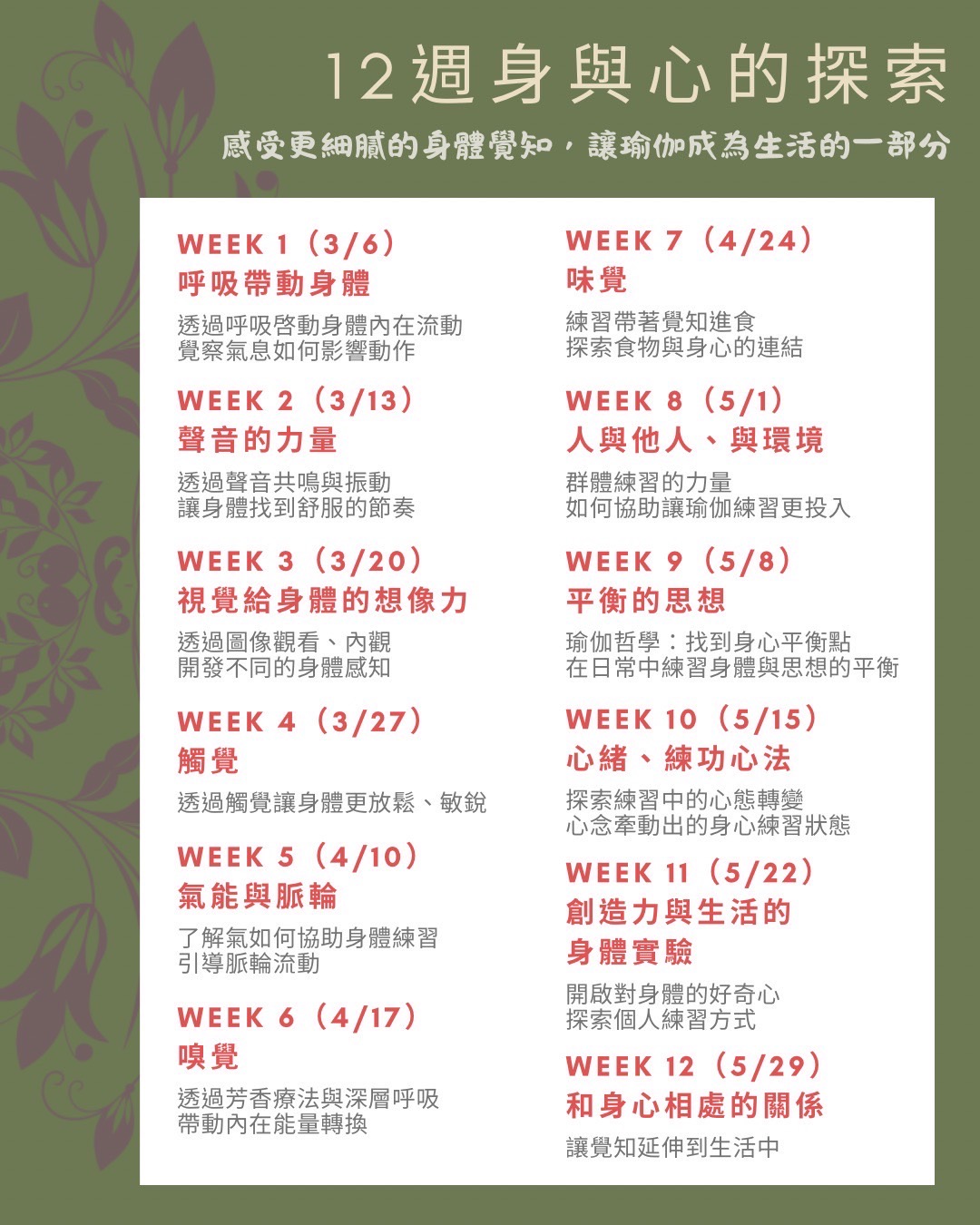 時間:3/6-5/22 每週四早上10:30-11:40(共12堂)