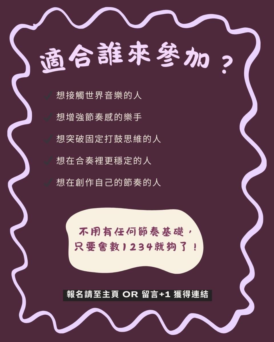 - 穿著輕便舒適,方便坐姿夾鼓的服裝(短裙or窄裙盡量避免唷!)